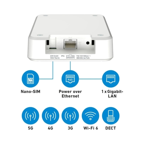 - Πλεονέκτημα έναντι του προηγούμενου μοντέλου FRITZ!Box 6850 5G: υψηλότερες ταχύτητες Wi-Fi 6, καλύτερη αντοχή IP54.